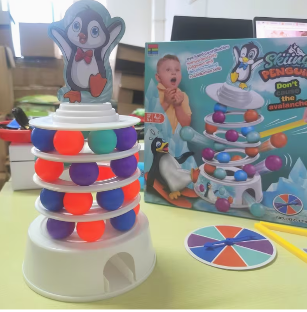 1️⃣ Okreni strelicu sa bojama 2️⃣ Strelica pokaže boju 3️⃣ Izvuci lopticu te boje iz kule 4️⃣ Pingvin mora ostati na vrhu ❄️